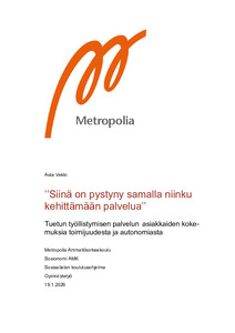 Opinnäytetyössä oli tavoitteena saada tietoa haastavassa työmarkkina-asemassa olevien täsmätyökykyisten asiakkaiden kokemuksista Tuetun työllistymisen palvelussa. Yhteiskunnallisesti haavoittuvassa asemassa olevien ihmisten kuuleminen on tärkeää, sillä se tuo heidän äänensä kuuluviin. Palvelukokemusten tutkiminen voi auttaa palvelun kehittämisessä ja suunnittelussa. Asiakkaiden palvelukokemuksia käsiteltiin toimijuuden ja autonomian näkökulmasta. Tutkimuskysymyksiä olivat: Millaiset tekijät palvelussa tukevat asiakkaan toimijuutta ja autonomiaa? Millaisia merkityksiä asiakkaat liittävät palveluun? Työelämäkumppanina toimi Helsingin kaupungin vammaispalvelujen alaisuudessa toimiva Tuetun työllistymisen palvelu.