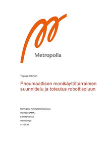 Työn tavoitteena oli suunnitella ja toteuttaa pneumaattinen monikäyttötarrain robottisoluun. Monikäyttötarrainta käyttäen robottikäsivarren ja kaksikaraisen automaattisorvin välistä yhteistyötä voidaan tehostaa. Tämä ratkaisu tehostaa sorvattavien kappaleiden tuotantoa nopeuttamalla valmiiden kappaleiden siirtoa sorvista ja uusien aihioiden tuomista sorviin. Työn tarkoituksena oli toteuttaa tarttujien kiinnitys robottiin. Lisäksi työssä käsiteltiin tarttujien ohjausta robotin käyttöliittymän avulla.