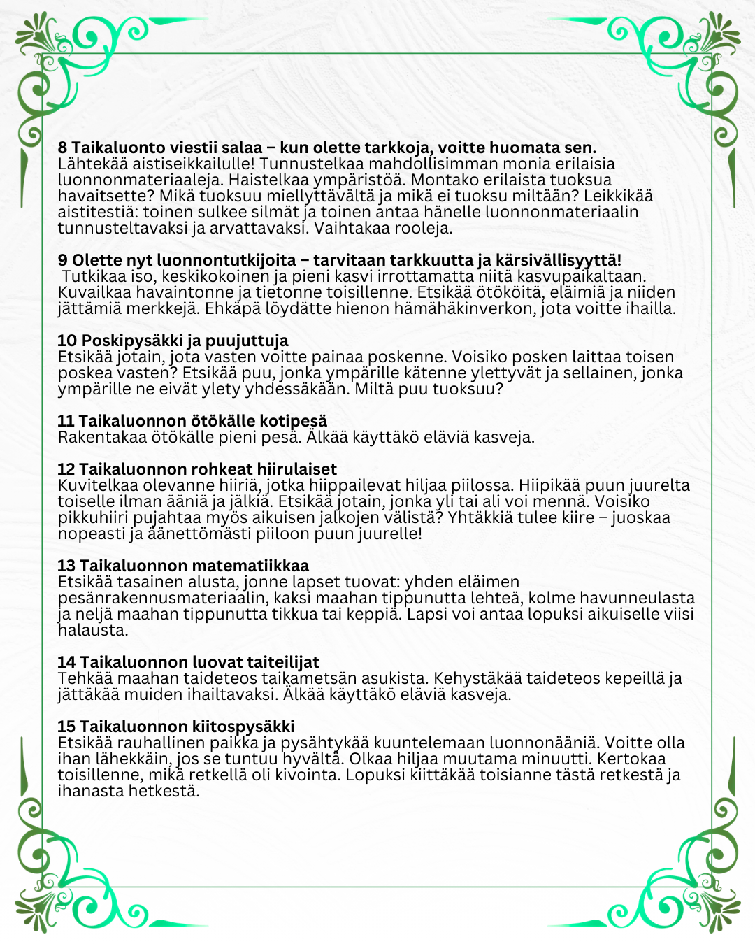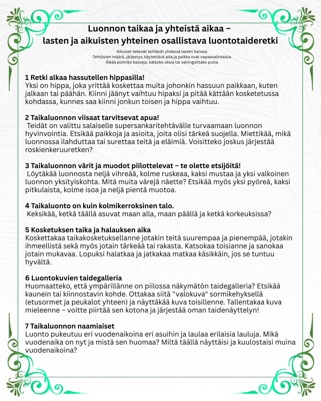 Kehittämistyön tavoitteena on luoda hyvinvointia ja osallisuutta edistävä Pop up -luontotaideretken toimintamalli, joka kannustaa lapsia ja aikuisia yhteiseen luonnossa liikkumiseen ja luovaan toimintaan. Kehittämistyö pohjautuu KATE-Kainuuseen terveyttä ja mielen hyvinvointia -hankkeen toimeksiantoon. Toimeksianto koskee hankkeessa koostetun Kainuun mielen hyvinvoinnin ohjelman (2025–2029) lapsille ja lapsiperheille asetettuja tavoitteita ohjelman painopisteessä luonto, liikunta ja kulttuuri. Kehittämistyössä tuotetaan kuntien hyvinvoinnin ja terveyden edistämisen työtä tukeva maksuton ja helposti käyttöönotettava 3–8-vuotiaiden lasten ja aikuisten yhteinen Pop up -luontotaideretki.
