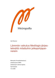 Tämä opinnäytetyö tehtiin Metropolia ammattikorkeakoulun liikelaboratorion tilauksesta osana jalkaterapian tutkinto-ohjelmaa (AMK). Opinnäytetyössä suunniteltiin ja toteutettiin soveltava työelämää palveleva lämpötilamittaustutkimus Medilogic-järjestelmän painepohjallisille, jonka tarkoituksena oli selvittää, onko kehon tuottaman lämmön ja painemittaustulosten välillä yhteyttä. Työn tavoitteena on tuottaa lisää tietoa kehon tuottaman lämmön vaikutuksesta Medilogic-painepohjallismittaustuloksiin.