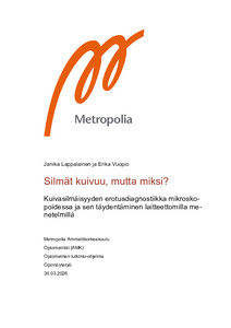 Opinnäytetyön tarkoituksena oli syventää ymmärrystä kuivasilmäisyyden erotusdiagnostiikasta sekä hyödyntää silmän etuosan mikroskopointia ja täydentää kuivasilmätutkimusta laitteettomilla menetelmillä, kuten oirekyselyllä ja schirmerin testillä. Työn tavoitteena oli tuottaa suomenkielistä materiaalia ja kehittää valmiuksia alan asiantuntijoille tunnistamaan kuivasilmäisyyden aiheuttaja.