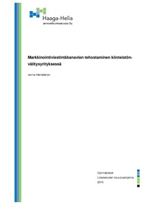 Tämä opinnäytetyö tehtiin toimeksiantona kiinteistönvälitysalan yritykselle keväällä 2015. Opinnäytetyön tavoitteena oli selvittää kiinteistönvälitysalan yritykselle sopivimmat ja kustannustehokkaimmat markkinointiviestintäkanavat, joilla tavoittaa heidän suuri kohderyhmänsä sekä erottautua laajassa kilpailukentässä.