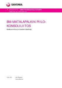 Tämä opinnäytetyö on jatkoa Visa Järvisen opinnäytetyöhön BM-matalapalkin piilokonsoliliitos. Lujuuslaskenta ja koesuunnittelu, 26.5.2014. Järvisen opinnäytetyössä tarkasteltiin uudentyyppistä elementtiliitosta, jossa matalapalkki tukeutuu piilokonsolin varaan lovipääliitoksella. Liitoksen suunnitteli Insinööritoimisto SRT Oy, ja työn tilaaja oli Betonimestarit Oy. Tämän opinnäytetyön tavoitteena oli toteuttaa Järvisen opinnäytetyössä suunniteltu koejärjestely ja tehdä suunnitellut murtokuormituskokeet.