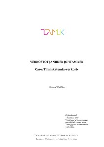 Opinnäytetyön tarkoituksena oli tutkia verkostojen syntymekanismeja sekä niihin liittyviä johtamismalleja ja –työkaluja. Caseverkostona työssä toimi Tiimiakatemia- verkosto. Tiimiakatemia- verkosto on 22 vuoden aikana rakentunut globaali verkosto, joka on saanut alkunsa suomalaisesta oppimisen innovaatiosta, Tiimiakatemiasta. Se on muotoutunut vuosien aikana yksinapaisesta, paikallisesta yhteisöstä ja verkostosta hajautetuksi, moninapaiseksi verkostoksi. V erkoston rakentuessa yhä moniulotteisemmaksi ja hallitsemattomammaksi on myös johtamishaaste kasvanut moninkertaiseksi. Opinnäytetyön tavoitteena oli mallintaa tätä kasvupolkua sekä sen kautta antaa suuntaviivoja ja konkreettisia työvälineitä verkoston edelleen kehittämiseen.