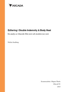 Mitt examensarbete är en analys av två filmers tidsperiodiska skillnader i editeringsstilar. Filmerna som ingår i analysen är Double Indemnity (1944) och Body Heat (1981). Syftet med arbetet är att se hur dessa filmer med liknande berättelser och 30 år mellan varandra använder sig av olika editeringsstilar som är representativa av tidsperioden de är gjorda i. På samma gång vill jag se hur dessa stilar påverkar hur en åskådare upplever filmen. Arbetet är begränsat såvida att jag enbart fokuserar mig på vad jag kommer fram till genom dessa två filmer. Jag går i mitt arbete igenom flera scener ur båda filmer som ger en klar bild av hur de är editerade och efteråt jämför jag två av dessa scener för att komma till en slutsats. Denna slutsats är att Double Indemnity framför sin berättelse mera obrutet som resulterar i att filmen känns mera fokuserad, medan Body Heat är snabbare och mera komplext editerad och resulterar i en mera uppmärksamhetsväckande upplevelse. Men båda filmerna lyckas på sitt eget sätt att hålla upp dramat och spänningen i filmen som bevisar hur en simpel och komplex stil kan fungera lika bra. My thesis is an analysis of time period differences in the editing styles of two films. The films in question are Double Indemnity (1944) and Body Heat (1981). The aim of this study is to see how these films with similar stories and 30 years between each other use different editing styles which are representative of the time periods they are made in. I want at the same time to see how these styles affect how the viewer experiences the film. This thesis is limited so that I focus solely on the results I get through these two films. In my analysis I go through several scenes from both films that give a clear image on how they are edited and afterwards I compare two of these scenes in order to get a result. This result is that Double Indemnity presents its story more uninterrupted which helps the film feel more focused, while Body Heat is quicker and edited in a more complex manner which results in a more attention-grabbing experience. But both films succeed in their own way to keep up the drama and suspense that proves how simple and complex styles work equally well.