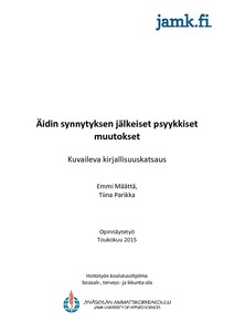 Tämän opinnäytetyön tarkoituksena on koota tutkimustietoa äidin synnytyksen jälkeisistä psyykkisistä muutoksista. Tavoitteena on, että opinnäytetyötä voidaan käyttää ohjauksen tukena työelämässä ja alan opiskelijoiden tukimateriaalina. Opinnäytetyö on suunnattu terveysalan ammattihenkilöstölle ja alan opiskelijoille.