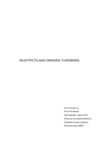 Arvonen, Anni & Perälampi, Anne. Muistipotilaan omaisen tukeminen. Helsinki, syksy 2015, 47 sivua, 5 liitettä. Diakonia-ammattikorkeakoulu. Hoitotyön koulutusohjelma, Hoitotyön suuntautumisvaihtoehto, sairaanhoitaja (AMK).
