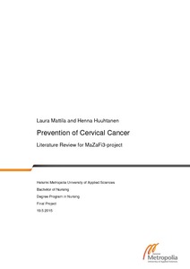 Tutkimuskysymys on: mitkä ovat parhaat näyttöön perustavat hoitokäytänteet kohdunkaulan syövän ennaltaehkäisyssä? Tämä työ on sovellettu systemaattinen kirjallisuuskatsaus, jonka aineisto on kerätty elektronisista tietokannoista (CINAH and MEDLINE). Kirjallisuuskatsaus tarkastelee 19 tieteellistä artikkelia.