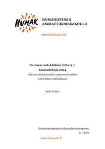 Tutkielman tavoitteena oli tuottaa Suomen rock-klubien liitto ry:lle materiaali, jolla tuoda esille toiminnan volyymia ja ammattimaisuutta, nostaa alan arvostusta sekä tuoda esille alan piileviä ongelmakohtia, joihin puuttumalla pystytään kehittämään klubikentän toimintaedellytyksiä sekä parantamaan edunval-vontaa. Opinnäyte pyrkii toimimaan välineenä, jolla perustella kannanottoja ja vastineita niin poliittisen päätöksenteon vipuvartena kuin alan ajankohtaisissa keskusteluissa.
