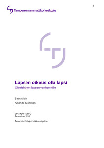 (2026)Tässä toiminnallisessa opinnäytetyössä selvitettiin, mitkä tekijät vaikuttavat oikeudenmukaisen lapsuuden toteutumiseen ja miten vanhemmat voivat tukea sitä. Opinnäytetyön tuotoksena tehtiin ohjelehtinen 4–7-vuotiaiden ... -