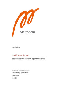 (2025)Tämä opinnäytetyö on kehittämistyö, jossa käsitellään B2B-asiakkaiden aktivointia tapahtuman avulla. Tavoitteena on, että tilaajaorganisaatiossa voidaan toteuttaa paremmin asiakkaita aktivoivia ja palvelevia tapahtumakok ... -