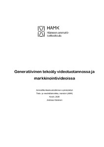 (2026)Tässä opinnäytetyössä tutkittiin, miten tekoälyä voidaan hyödyntää videotuotannossa viestinnän ja markkinoinnin kontekstissa. Taustalla on tekoälyn nopea kehitys ja sen tarjoamat uudet mahdollisuudet visuaalisen sisällön ... -